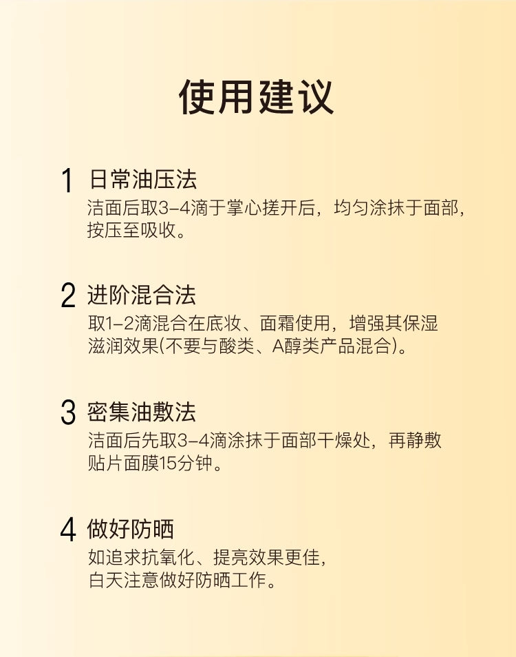 Apply 2–4 drops to cleansed skin in the evening, either alone or mixed with moisturizer.