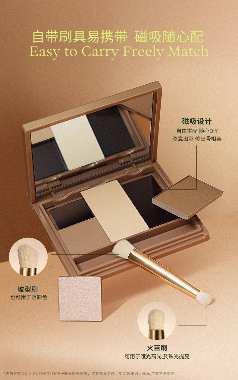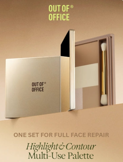 The OUT-OF-OFFICE 3D Contouring Multi-Purpose Palette offers a versatile solution combining highlighter, contour, base, and blush/eye shadow in one compact.