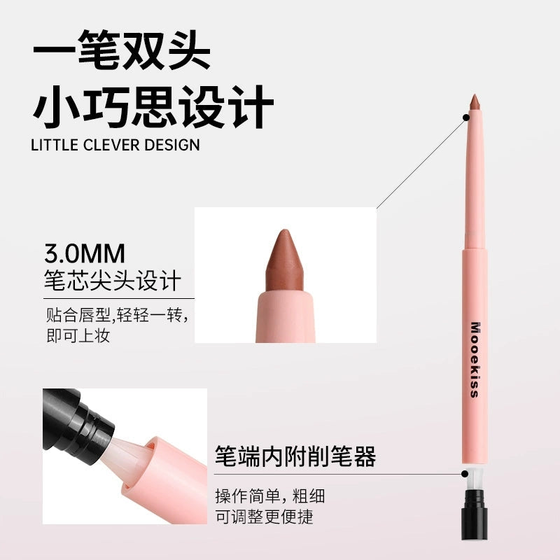 The Mooekiss Velvet Mist Lip Liner combines precision and performance in a dual-ended design, featuring a richly pigmented, velvety lip liner on one end and a built-in sharpener on the other. Its waterproof, long-wearing formula allows you to sculpt, define, or fill lips with vibrant, natural-looking color that stays put for hours. Designed to enhance lip shape with a subtle brightening effect, it’s the perfect tool for creating fuller, well-defined lips with a velvety matte finish.